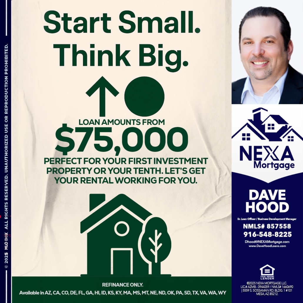 Hi, my name is Dave Hood. I’m a Loan Officer with NEXA Mortgage LLC., offering personalized mortgage solutions, fast customized quotes, great rates and service with integrity.